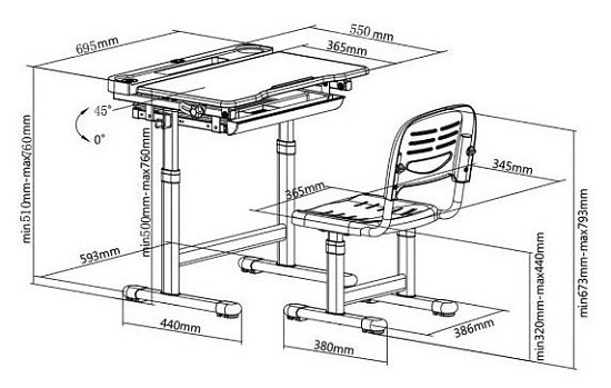 Поверхность учебного стола можно наклонять до 45 ° для удобного письма, чтения и рисования.