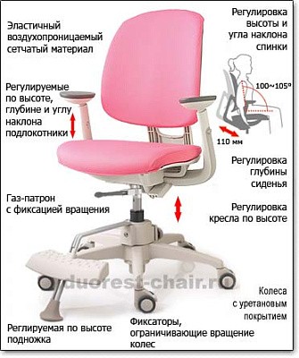 Регулировка глубины и высоты сиденья, высоты и угла наклона подлокотников, регулировка высоты кресла в соответствии с ростом и индивидуальными особенностями пользователя позволяют полностью отрегулировать кресло для максимального комфорта школьника.