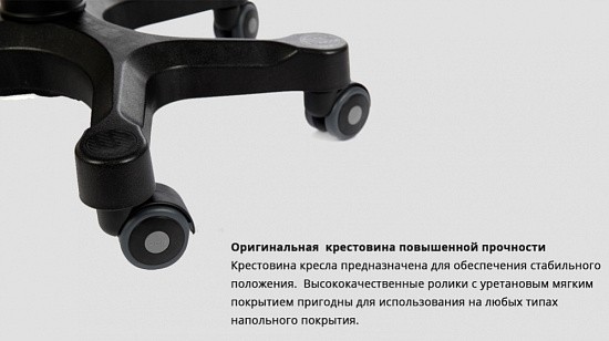 Крестовина в черном цветовом исполнении имеет компактный размер, изготавливается из нейлона, выдерживает нагрузку свыше 300 кг и защищена пожизненной гарантией на излом. Удобно сконструированная форма крестовины опирается на 6 колес с полиуретановой оболочкой, что гарантирует полную устойчивость кресла.