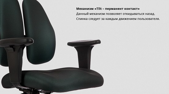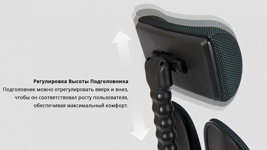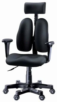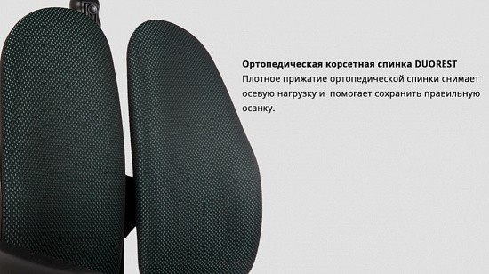 Эргономичное кресло имеет регулируемый по высоте подголовник, оснащенный возможностью смены угла наклона, систему раздвоенной спинки BACKREST с ортопедическими функциями, настраиваемую под индивидуальные физические данные пользователя. Подвижные части крепятся на гибкие соединения к опоре - металлическому штифту с помощью резиновых держателей. Такая технология позволяет двигаться кресельной спинке в 3D-режиме, оптимально поддерживая положение тела в любой сидячей позе пользователя.