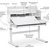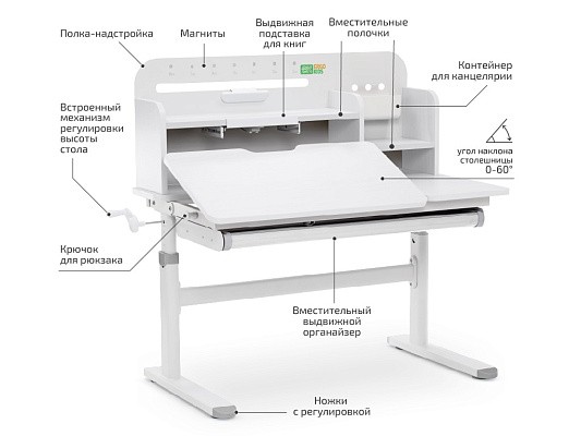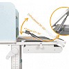 Столешница разделена на две части. Подвижная часть изменяет угол наклона до 60 градусов с помощью газлифта, что позволяет подобрать положенияе для чтения, письма, рисования. Для безопасности регулировки детьми на краю столешницы предусмотрен специальный зазор.