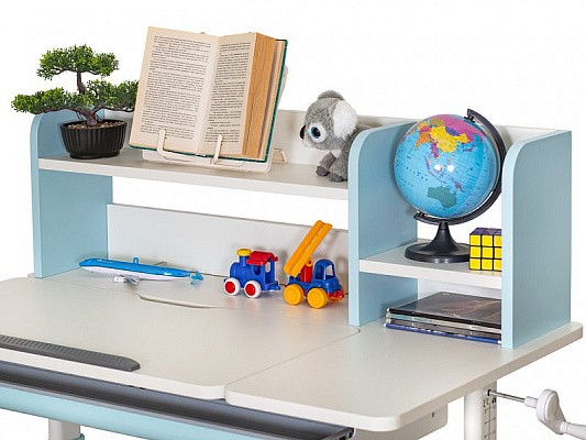 Стол дополнен полкой-надстройкой, состоящей из полок для удобного хранения школьных принадлежностей.