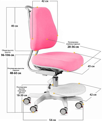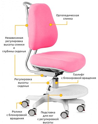 У кресла независимая регулировка высоты спинки и глубины сиденья, что позволяет еще более точно подстроить кресло под параметры ребенка. Высота всего кресла регулируется с помощью качественного газлифта. Отсутствие вращения газлифта помогает зафиксировать правильное положение ребенка во время занятий.