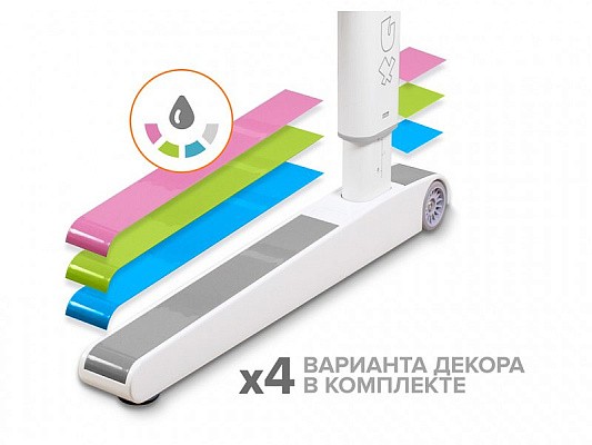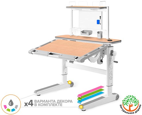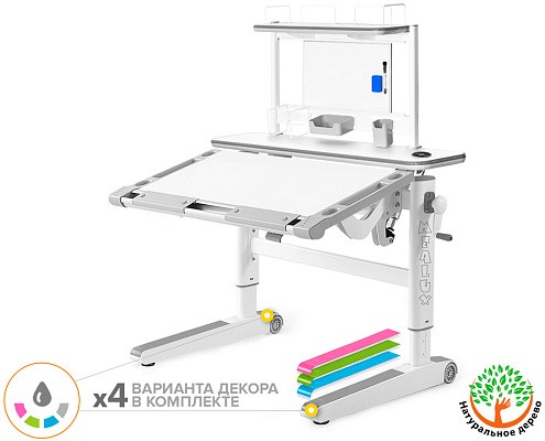 Важной особенностью комплектации Mealux ErgoWood - L Multicolor является возможность менять цветные накладки, которые идут сразу в комплекте к столу. Всего доступно 4 варианта декора: серый, голубой, розовый и зеленый. Кроме того, вы можее создавать собственный дизайн вашего стола, комбинируя различные накладки разных цветов между собой.