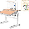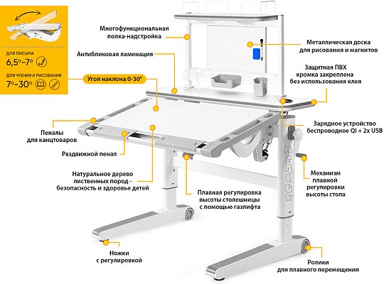 Рабочая поверхность стола с регулируемым углом наклона до 30 градусов. Поэтому, можно установить оптимальный угол наклона для занятий (чтение, письмо, рисование). в результате, будет поддерживаться правильная осанка, а также глаза ребенка будут на безопасном расстоянии от учебника / тетради.