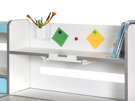 На функциональной надстройке есть несколько полочек для размещения книг, либо монитора. Металлическую стенку стола можно использовать для размещения заметок.