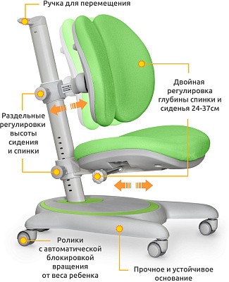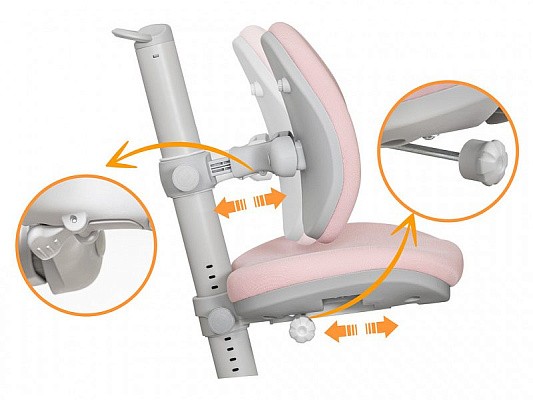 Главная особенность кресла - увеличенный диапазон регулировки глубины сидения за счет подвижной спинки. Глубина спинки плавно регулируется специальным механизмом. Глубина сиденья – ручкой -фиксатором. Кресло подойдет для детей от 3х лет до взрослого возраста.