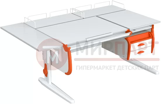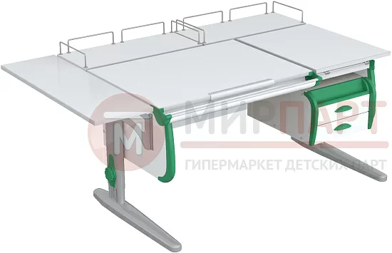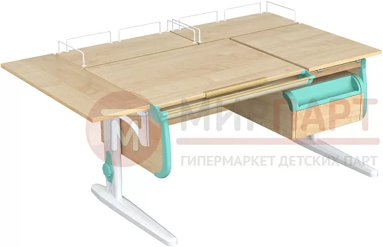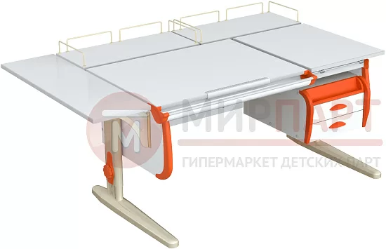 Функциональность парты также на высоте: раздельная столешница предоставляет возможность создания двух рабочих зон. Неподвижная часть отводится под хранение книг и учебников, в то время как угол наклона подвижной части легко может меняться, в зависимости от рода занятия ребенка – чтение, письмо, рисование или черчение. Тумбочка с двумя просторными ящиками и открытый пенал помогут школьнику разместить те вещи, которые не нужны постоянно, но должны оставаться под рукой. Две задние приставки плюс короткая боковая полочка завершают картину, создавая в итоге настоящий рабочий кабинет.