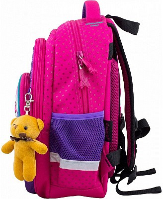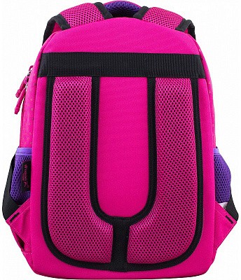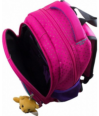 В школьном рюкзаке два основных отделения и карман-органайзер. Основное отделение с 2 двумя разделителями и резинкой для крепления школьных принадлежностей. Второе отделение без наполнения. Спереди вместительный карман на молнии украшенный объёмной 3D картинкой с органайзером для письменных принадлежностей. По бокам карманы-сеточки на резинке.